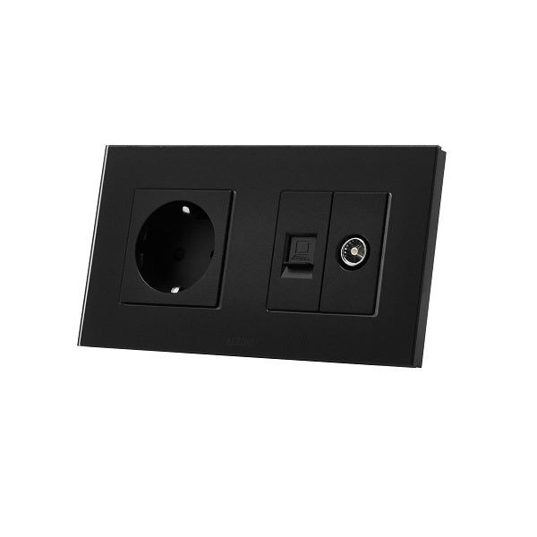 Priza simpla 2P+T 16A + priza RJ45 Cat.6 + priza TV, rama din sticla, negru, Aledio A1PNTN
